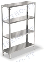 Стеллаж, 4 сплошные полки из нержавеющей стали AISI 430 толщиной 0,5 мм с усилителем. Расстояние между полками регулируемое с шагом 50мм. Каркас из уголка оцинкованной стали толщиной 1,5 мм. Распределенная статическая нагрузка на полку - 50 кг. Наличие подгибов по периметру полки исключает опасность травм.