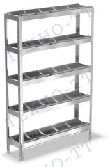 Стеллаж для тарелок с пластиковой кассетой и поддоном для сбора жидкости, стойки из нержавеющей стали AISI 430 толщиной 1,5 мм. Вместимость - 250 тарелок.