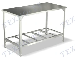 Стол производственный без борта, столешница из нержавеющей стали AISI 430 толщиной 0,5 мм с подложкой ДСП толщиной 16 мм. Каркас из оцинкованной стали толщиной 1,5 мм, полка-решетка из оцинкованной стали толщиной 0,8 мм. Полка стола выдерживает распределенную статическую нагрузку - 20 кг, столешница - 100 кг. Наличие подгибов по периметру столешницы и полки исключает опасность травм.