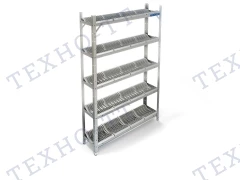 Используются в моечном отделении для сушки и кратковременного хранения чистой посуды. Стеллаж сделан из стоек и полок. Полка состоит из кассеты для тарелок и каркаса. Кассета представляет собой решётку с ячейками, в которые помещаются тарелки. Кассета изготовлена из пищевого пластика, каркас из нержавеющей стали марки AISI 430. На одной полке помещается 40 тарелок, либо 50 стаканов на кассете предназначенной для стаканов, весь стеллаж рассчитан на 200 тарелок или 250 стаканов. Внизу стеллажа расположен поддон, предназначенный для сбора жидкости, поступающей с мокрой посуды. Поддон изготовлен из пищевой нержавеющей стали марки AISI 430. Высота полок регулируется. Шаг регулировки - 100 мм. Ножки стеллажа снабжены регуляторами высоты, что позволяет устранить неровности пола и дополнительные конструктивные элементы, предназначенные для предотвращения его раскачивания во время работы и придающие большую устойчивость. Универсальная конструкция позволяет легко производить сборку стеллажей. При необходимости можно приобрести любое количество полок дополнительно.