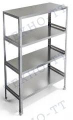 Используется в кухонных цехах для хранения сухих видов продуктов и кухонного инвентаря. Стеллаж имеет разборную конструкцию и состоит из четырёх стоек и четырёх полок. Стойки изготовлены из конструкционного профиля толщиной 2 мм, покрытого порошковой краской. Полки сплошные изготовлены из нержавеющей стали AISI430, могут крепиться на требуемой высоте - шаг 100 мм. Ножки стеллажа снабжены регуляторами высоты, что позволяет устранять неровности пола и дополнительные конструктивные элементы, предназначенные для предотвращения его раскачивания во время работы и придающие большую устойчивость. Универсальная конструкция позволяет легко производить сборку стеллажей. Нагрузка на каждую полку не более 150кг, при этом не более 400 кг на весь стеллаж. При необходимости можно приобрести любое количество полок дополнительно.