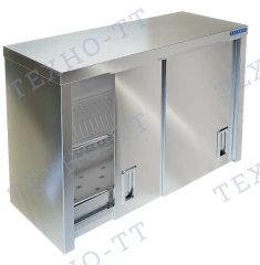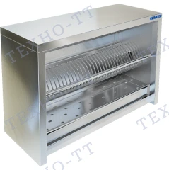 Полка-шкаф настенная для сушки посуды сварная из нержавеющей стали марки AISI 304 толщиной 0,8мм, двери-купе, на 23 тарелки 35 стаканов, поддон из нержавеющей стали марки AISI 304 толщиной 0,8мм, полка-кассета формованная под тарелки из нержавеющей стали марки AISI 304 толщиной 0,8мм, съемная. Задняя стенка оцинкованная сталь толщиной 0,55мм. Имеет накладки с вырезом "замочная скважина" для крепления к стене. Полка поставляется в собранном виде.
