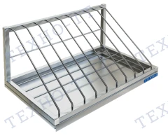 • Полки для досок и крышек снабжены 15 секциями, которые позволяют аккуратно разложить крышки кастрюль и доски одновременно. В таких моделях есть съёмный поддон для сбора воды, чтобы жидкость не стекала на пол или оборудование под полкой. Поддон легко достаётся для слива и очистки.