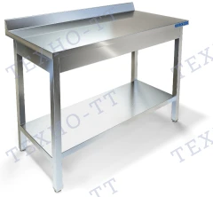 Стол производственный с объемным бортом высотой 70мм, столешница из нержавеющей стали марки AISI 430 толщиной 0,8мм, ЛДСП толщиной 32мм. Каркас разборный из трубы 40х40 нержавеющей стали марки AISI 430 толщиной 1,2мм. Обвязка из трубы 40х20 нержавеющей стали марки AISI 430 толщиной 1,2мм. Регулируемые опоры. Стол поставляется в разобранном виде.