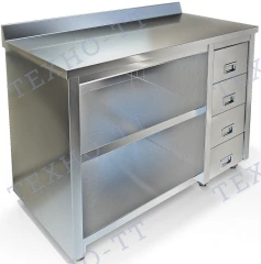 Стол-тумба без дверей с бортом высотой 70мм. Столешница из нержавеющей стали марки AISI 304 толщиной 0,8мм, ЛДСП толщиной 32 мм. Корпус, полка и четыре выдвижных ящика расположенных справа изготовлены из нержавеющей стали марки AISI 430 толщиной 0,8мм. Задняя стенка из оцинкованной стали толщиной 0,55мм. Регулируемые опоры. Стол поставляется в собранном виде.