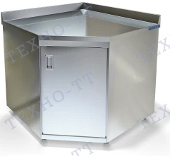 Стол-тумба имеет цельносварную конструкцию. Столешница изготовлена из пищевой нержавеющей стали, внутри столешницы ЛДСП. Внутри стола-тумбы основание и полка из пищевой нержавеющей стали, задняя стенка стола из оцинкованной или нержавеющей стали. Столешница стола имеет два борта, что дает возможность устанавливать его в угол помещения и тем самым рационально использовать производственные площади. Ножки стола снабжены регуляторами высоты, что позволяет устранять неровности пола. Изделие легко моется.