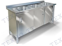 Ванны моечные являются необходимым атрибутом на любом предприятии общественного питания согласно требованиям СЭС. Используются ванны моечные для для мытья посуды, продуктов, инвентаря и т.п. Ванна состоит из трехсекционной цельнотянутой ёмкости мойки и каркаса. Мойка ванны цельнотянутая с шумопоглощающей изоляцией снизу, выполнена из пищевой нержавеющей стали марки AISI 304 толщиной 1 мм и имеет отгибы, которые исключают травмирование персонала, а также объемный пристенный борт. Отличительной особенностью наших цельнотянутых ванн является наличие обнижения, которое не позволяет воде попадать за пределы столешницы. Каркас изготовлен из нержавеющей стали марки AISI 430. Раздвижные дверцы "купе" позволяют сэкономить пространство кухни при их открытии. Ножки ванны снабжены регуляторами высоты, что позволяет устранить неровности пола. Ванны комплектуются сифоном с переливом, нержавеющим выпуском с решеткой диаметром 90 мм, диаметр выходного отверстия в сифоне 50 мм.