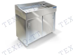 Стол-тумба для выкладки соков на льду предназначена для раздачи холодных напитков, а так же кратковременного хранения. Столы для выкладки соков на льду используются в столовых, кафе, ресторанах и других заведениях общественного питания. Стол для соков на льду состоит из ванны и каркаса. Каркас изготовлен из пищевой нержавеющей стали AISI 430, ванна из пищевой нержавеющей стали AISI 304.